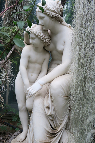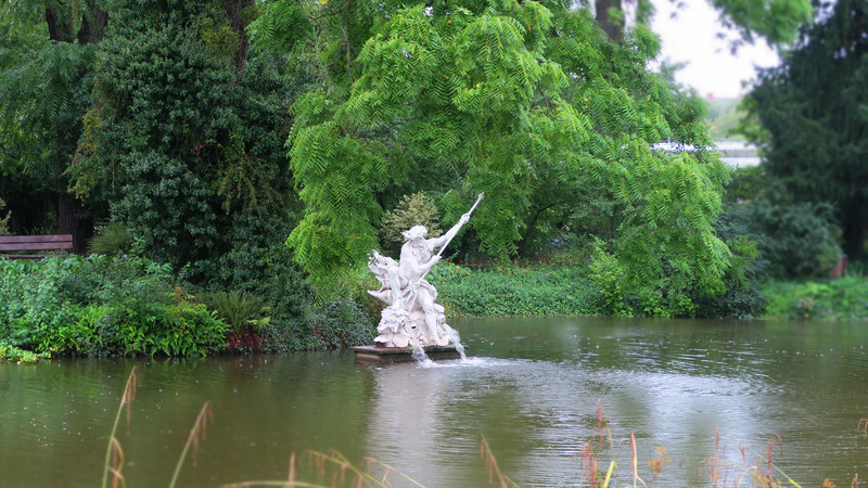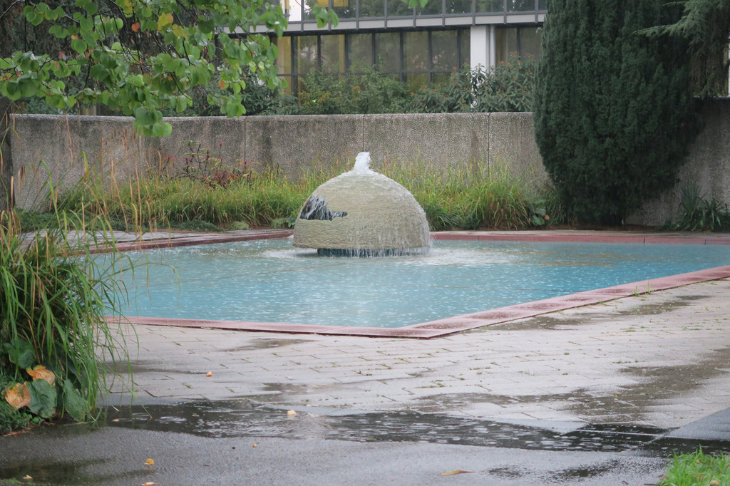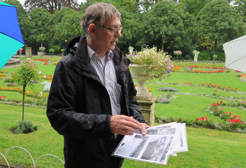 Auf seinem Rundgang im Regen erzählte er über die neuesten Skulpturen- Restaurierungen, bepflanzte Wasserbecken, Sommerbeete im Blumenhof und bedauerlicherweise waren auch Zerstörungen und Vandalismus sein Thema, nicht zuletzt wegen der aktuellen Zerstörung der Kugel des Mittelmeerbrunnens - siehe Fotogalerie.